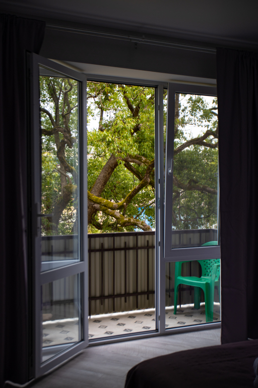 В апартаментах проведен беспроводной высокоскоростной интернет. Также в бесплатное пользование предоставляется гладильная доска и утюг. На балконах находятся удобные стульчики для отдыха и столик. Все окна и балконы апартаментов выходят на лужайку с деревьями, справа открывается вид на горы.