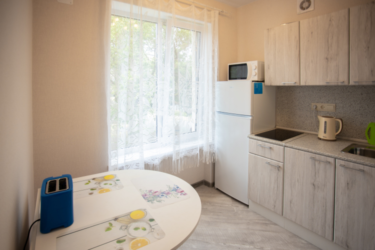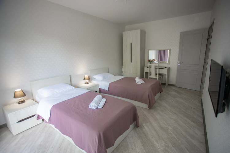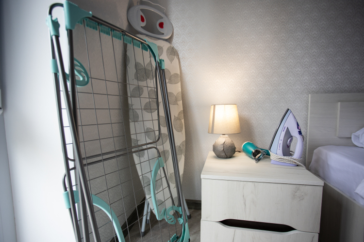 В апартаментах есть две изолированные одинаковые по площади спальни, которые расположены по разные стороны апартаментов, между комнатами находится коридор-прихожая, кухня, санузел, обе комнаты имеют балконы. В каждой комнате есть кондиционер, телевизор с кабельным TV, зеркало, эргономичная мебель, постельное белье и полотенца. На кухне есть холодильник с морозильной камерой, электрочайник, тостер, микроволновка, посуда, плита. В санузле есть душ, стиральная машина, фен.