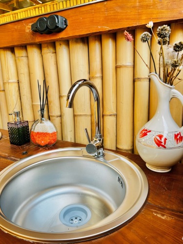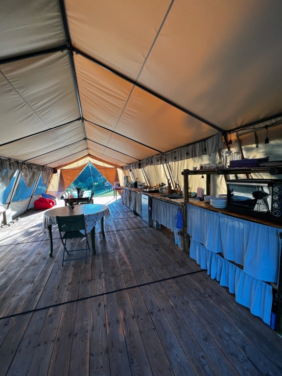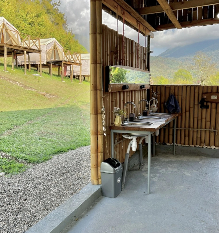 В распоряжении гостей кемпинга: 7 шатров с балконами, гамаками и видом на горы, шатёр-кухня, оборудованный всем необходимым для приготовления еды, походная баня с бассейном и вениками, бамбуковый корпус с туалетами и душевыми с горячей водой.