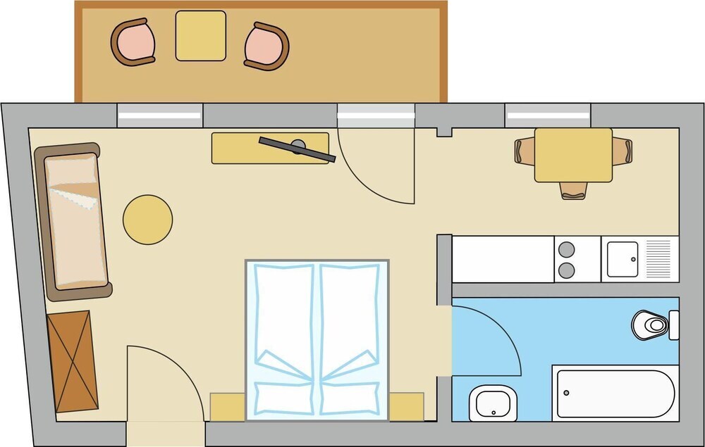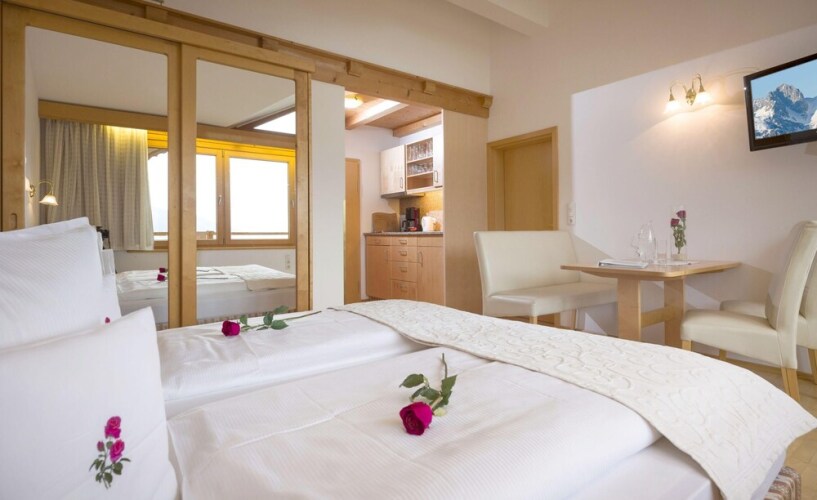 Отель Studio im Gartenhotel Rosenhof bei Kitzbühel 2 звезды, адрес на карте Оберндорф, Kreuzgasse 23, с описанием номеров и доступностью онлайн бронирования на сайте vashotel.ru , цены проживания и удобства.