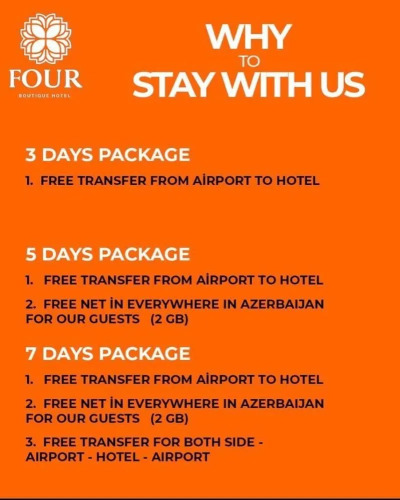«Four Boutique Hotel» находится в Баку. Этот бутик-отель располагается 1 км от центра города. Рядом с бутик-отелем можно прогуляться. Неподалёку: Азербайджанский Музей Ковра, Старый город Баку и Дворец Гюлистан.