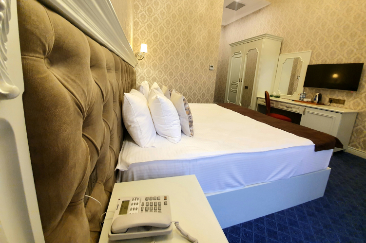 Номер уютно обставлен и оснащён необходимым, чтобы отдохнуть после долгого и насыщенного дня. Имеются DVD-плеер, телевизор, мини-бар и халат. Оснащение зависит от выбранной категории номера.