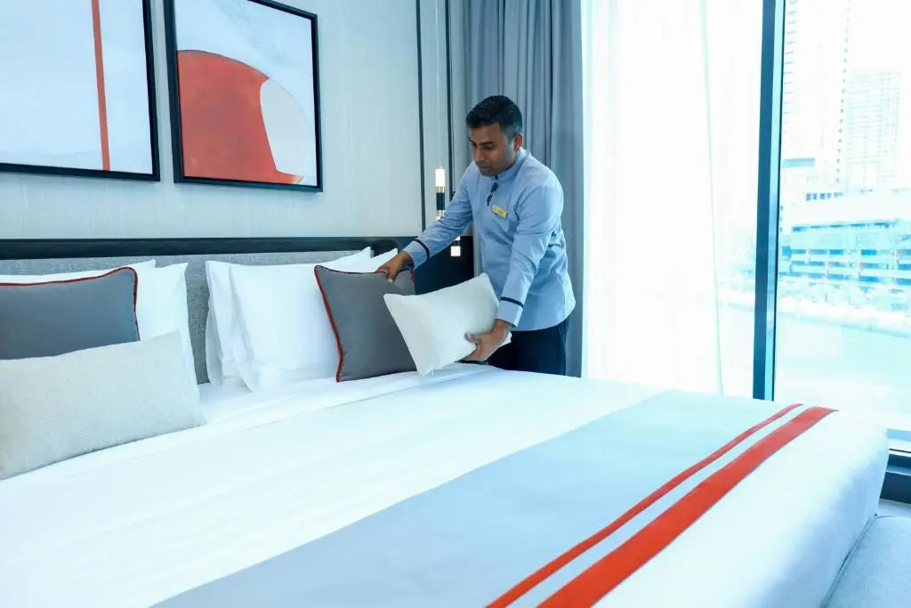The property is cleaned and disinfected using an electrostatic sprayer; disinfectant is used to clean the property; commonly-touched surfaces are cleaned with disinfectant between stays; bed sheets and towels are laundered at a temperature of at least 60°C/140°F; guestroom doors are sealed after cleaning.