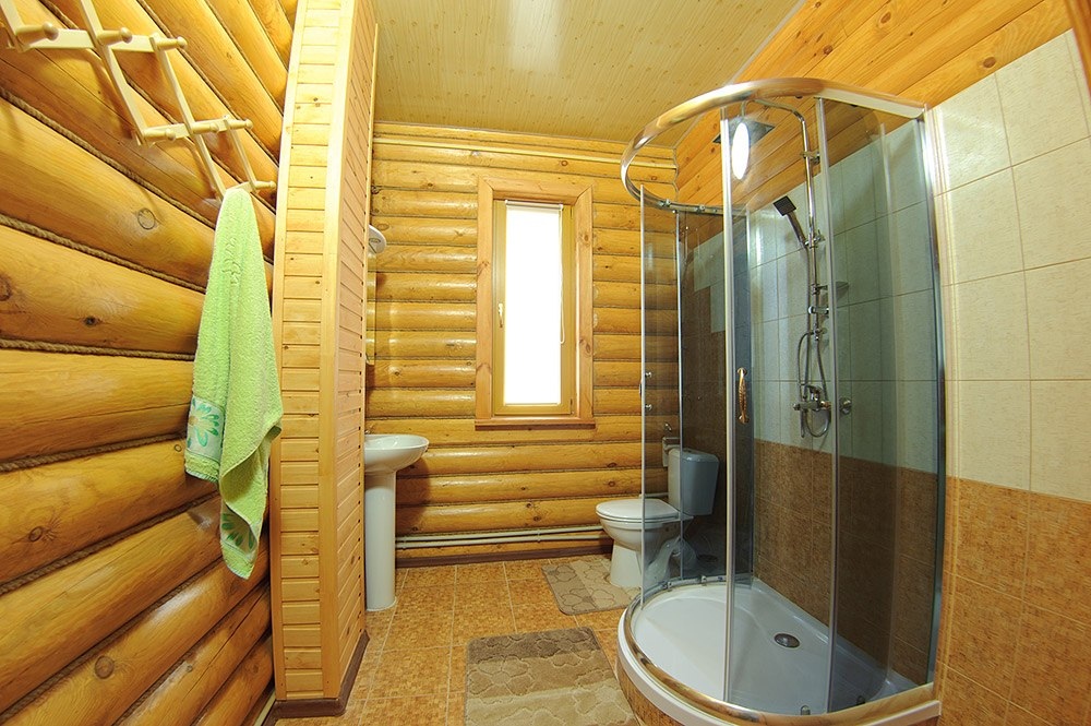 В номере категории «Стандартный трёхместный номер с двуспальной и односпальной кроватями» ванная комната находится в общем коридоре на два номера.