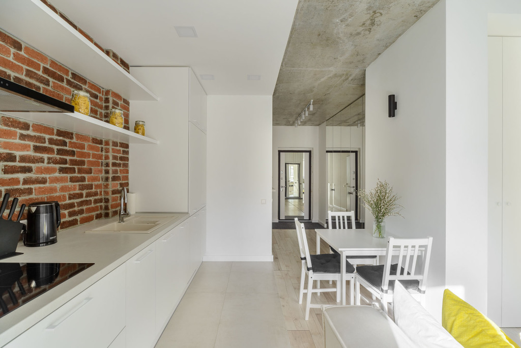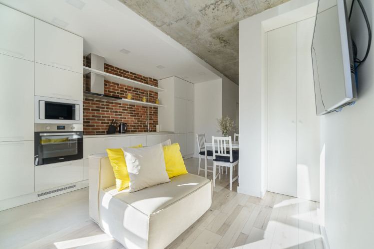 В квартире могут разместиться до двух человек. В апартаментах есть необходимая мебель: просторная двуспальная кровать king-size, диван, столовая зона.