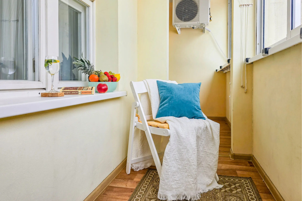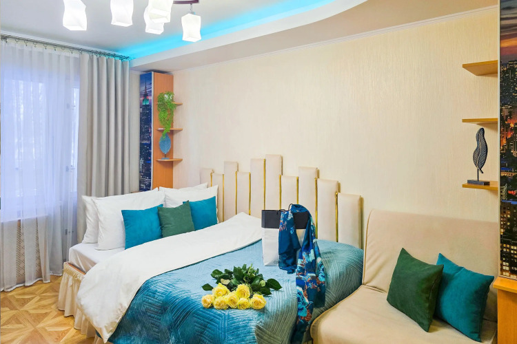 Спальные места: двуспальная кровать с ортопедическим матрасом и кресло-кровать. Квартира оснащена личным компьютером для командировочных и большим телевизором со Smart TV для отдыхающих пар, а также блэкаут-шторами и подсветкой. Оборудованная кухня включает плиту и духовку от Bosch, холодильник, СВЧ, фильтр для воды и необходимую посуду. Также в наличии ванная комната со стиральной машиной, отдельный санузел с гигиеническим душем. Также в распоряжении гостей: бельё, халаты и полотенца, высокоскоростной бесплатный Wi-Fi, кондиционер со сплит-системой.