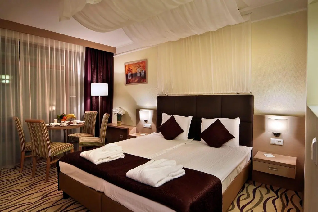 Здесь будем баловать себя водными процедурами: есть бассейн, аквапарк, крытый бассейн и открытый бассейн. Можно организовать деловую встречу, переговоры и даже собеседование. Для этого предусмотрены бизнес-центр и специальное оборудование. На курорте есть игровые детские комнаты. Будьте готовы к тому, что детям будет весело, а вам придется коротать вечер со взрослыми. Сотрудники курорта по запросу организуют гостям трансфер.