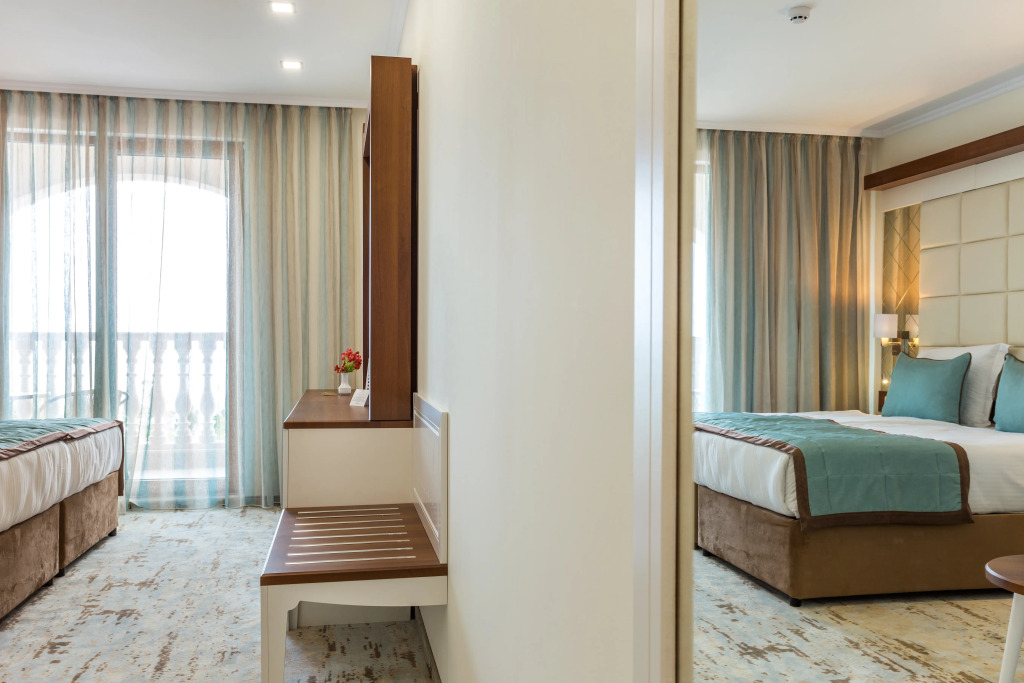 В номере вас будут ждать душ, телевизор, мини-бар и халат. Оснащение зависит от выбранной категории номера.