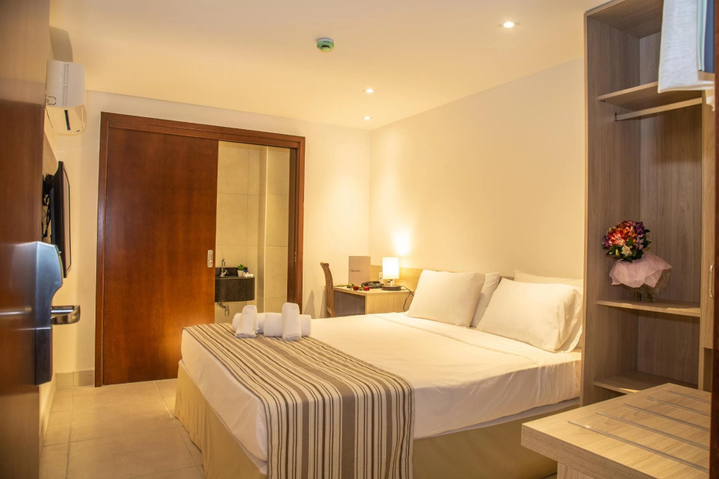 Здесь будем баловать себя водными процедурами: есть открытый бассейн. Если планируете экскурсии, обратите внимание на экскурсионное бюро отеля. Удобно для гостей с ограниченными возможностями: на верхние этажи гостей поднимает лифт. А ещё в распоряжении гостей прачечная, сейф и консьерж.