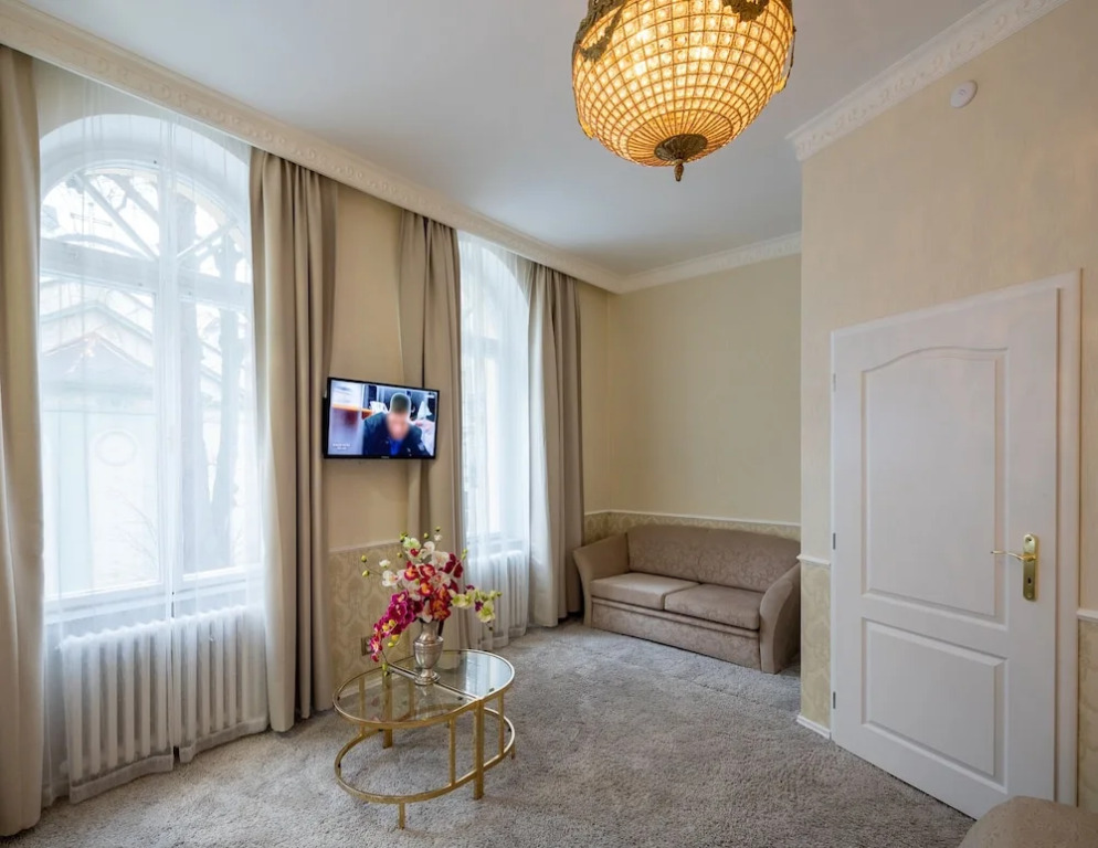 В отеле 15 комфортабельных, оформленных в изысканном дворянском стиле номеров. В каждом номере ванная с душем/ванной и туалетом, телевизор со спутниковым телевидением, холодильник, фен, сейф, кофейный автомат, бесплатный Wi-Fi.