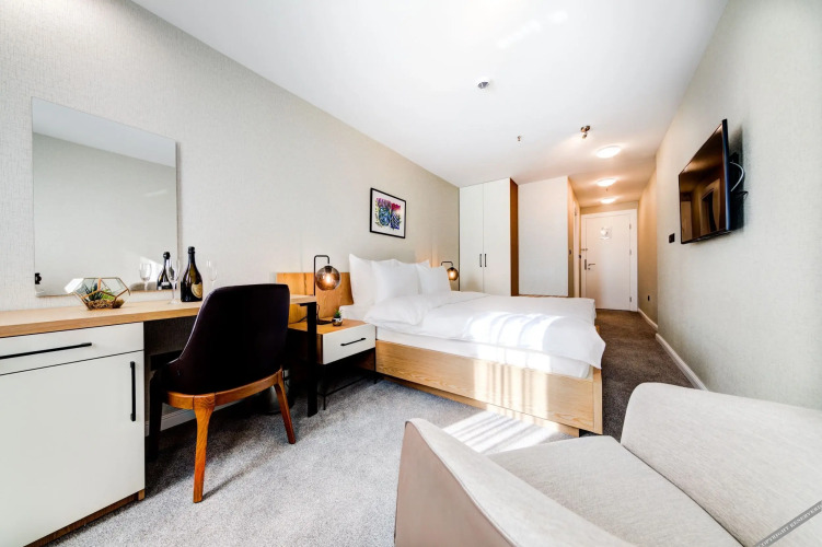 Номер уютно обставлен и оснащён необходимым, чтобы отдохнуть после долгого и насыщенного дня. Имеются телевизор, халат и тапочки. Оснащение зависит от выбранной категории номера.