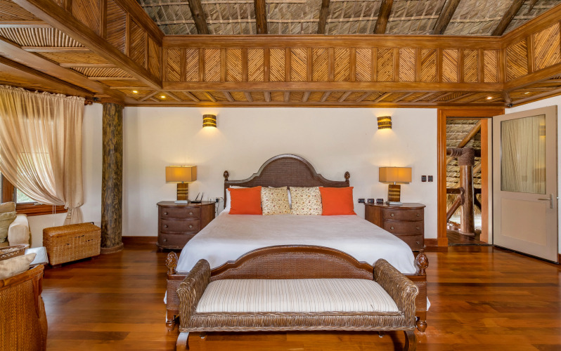 На втором этаже находится главная спальня с двуспальной кроватью, телевизором, зоной отдыха с диваном, сводчатыми потолками с потолочным вентилятором, кондиционером, шкафом, ванной комнатой с душем. В этой спальне есть собственный балкон.