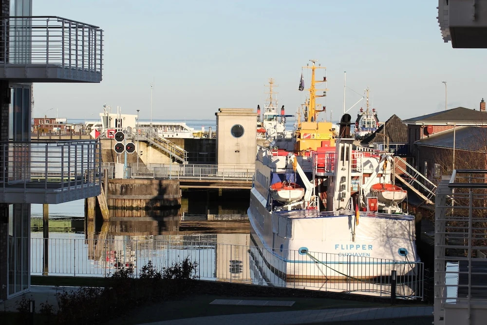 Отель Wohnen am Yachthafen W45, адрес на карте Куксхафен, Kapitän-Alexander-Straße 41, с описанием номеров и возможностью онлайн бронирования на площадке vashotel.ru , цены проживания и удобства.