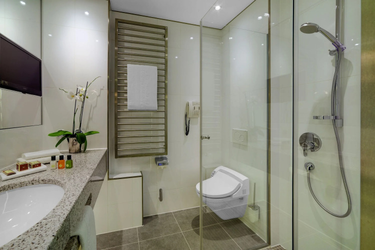 Номер уютно обставлен и оснащён необходимым, чтобы отдохнуть после долгого и насыщенного дня. Имеются душ, телевизор, мини-бар, халат и тапочки. Оснащение зависит от выбранной категории номера.