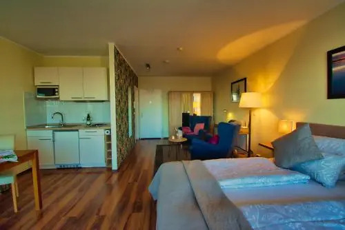 Номер уютно обставлен и оснащён необходимым, чтобы отдохнуть после долгого и насыщенного дня. Имеются душ и телевизор. Оснащение зависит от выбранной категории номера.