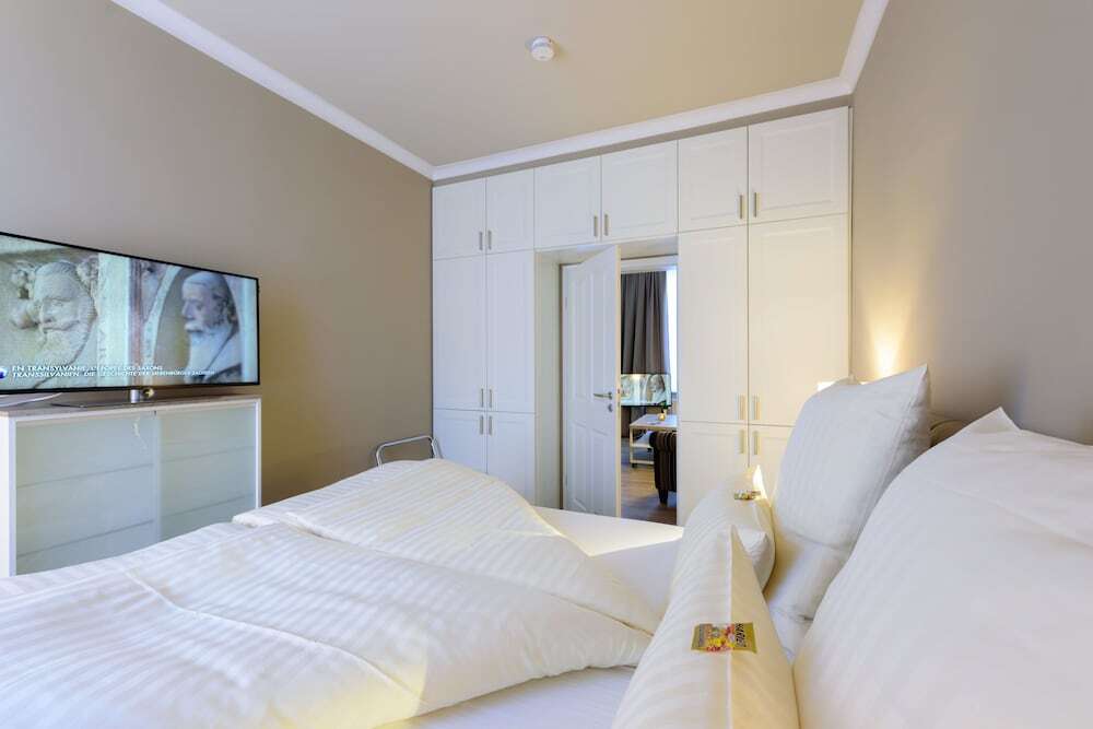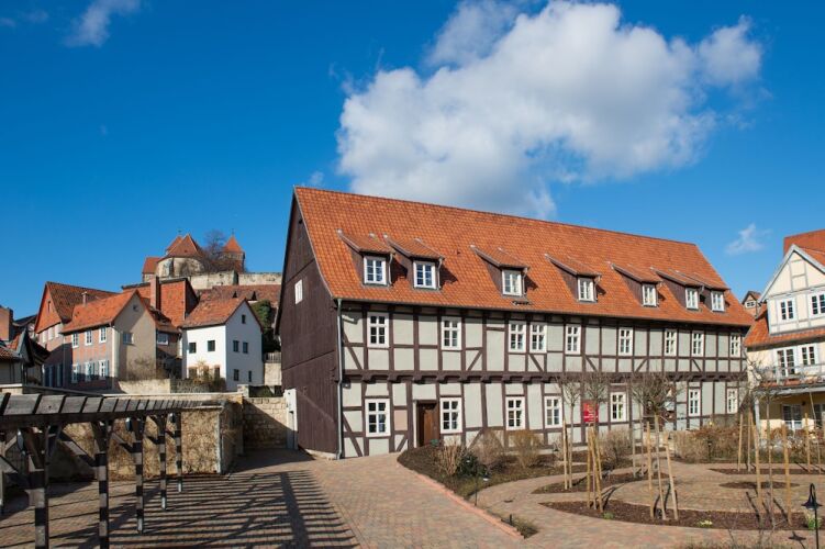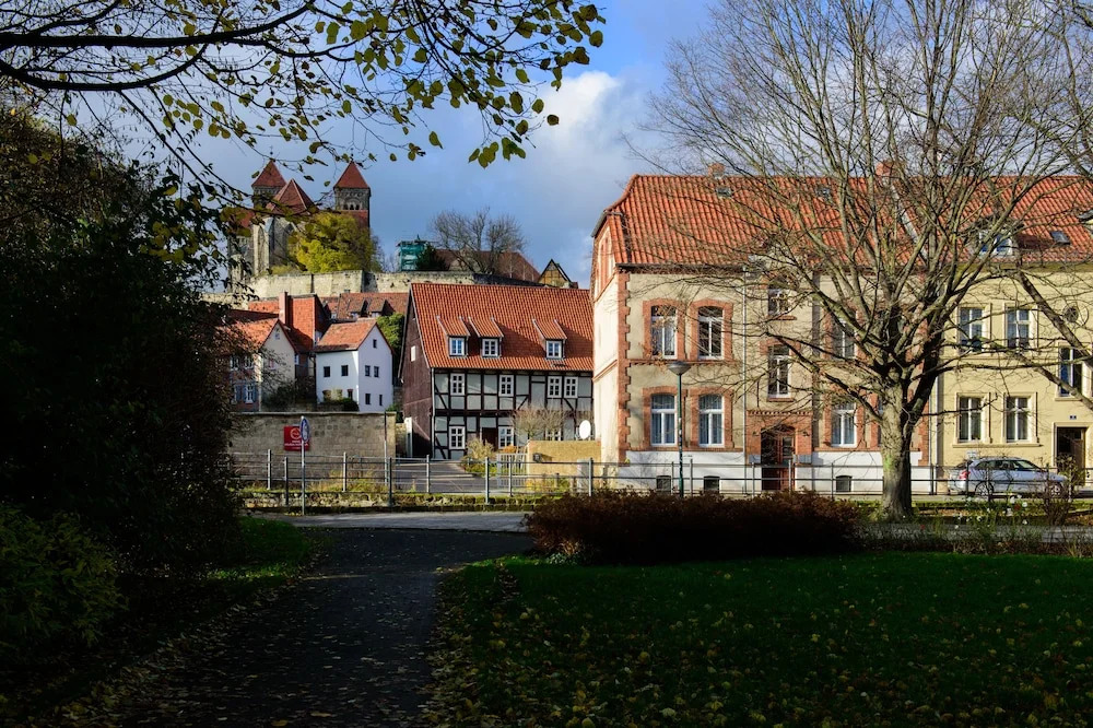 Отель Theophanos Appartements im Wasserwinkel, адрес на карте Кведлинбург, Im Wasserwinkel 1, с описанием номеров и доступностью онлайн бронирования на ресурсе vashotel.ru , цены проживания и удобства.