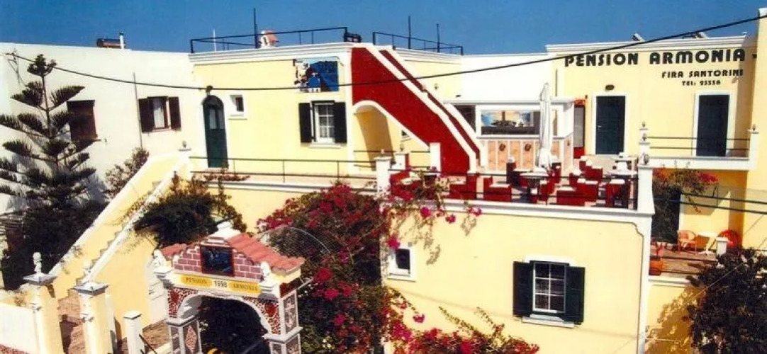 Подходящий вариант для бюджетного отдыха — отель «Pension Armonia» расположен в Фире. Этот отель находится в пешей доступности от центра города. Рядом с отелем — Старый порт Санторини и Порт Афиниос Санторини.