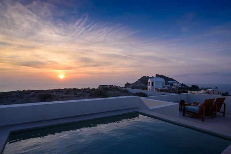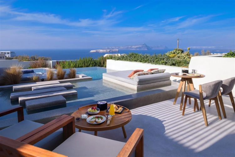 Бюджетный вариант для активного отдыха — отель «Potnia Theron Suites» расположен в Санторини. Этот отель находится в 9 км от центра города. Рядом с отелем — Белый пляж, Порт Афиниос Санторини и Старый порт Санторини.