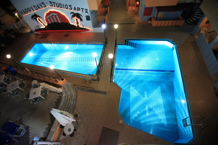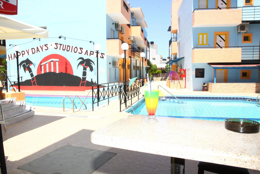 Двухзвёздочный апарт-отель Happy Days – прекрасное место для весёлого отпуска с друзьями. В отеле имеется ресторан и бар. Отель предоставляет целый спектр развлечений, здесь находится 2 открытых бассейна, проводятся различные тематические вечеринки и развлекательные вечера с барбекю. Возле бассейна находится бар, где можно заказать прохладительные напитки и закуски.