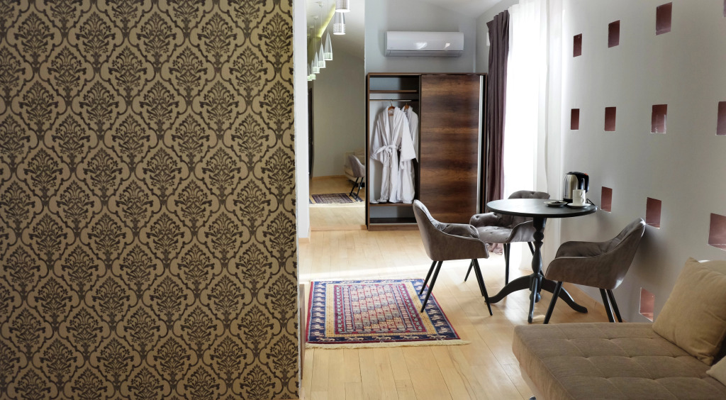 В номере вы найдёте телевизор, мини-бар и халат. Оснащение зависит от выбранной категории номера.