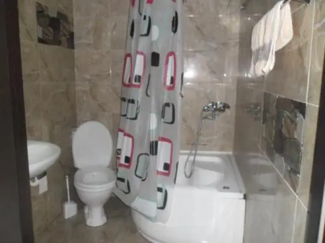 В номере вы найдёте душ, телевизор и тапочки. Оснащение зависит от выбранной категории номера.