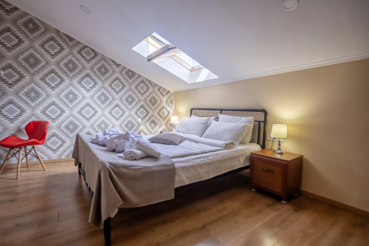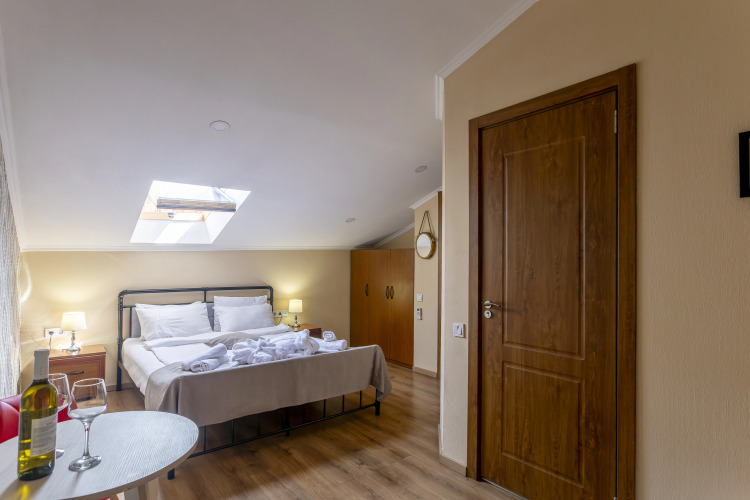 У стандартного номера с мансардными окнами есть затемняющая пленка на стекле.