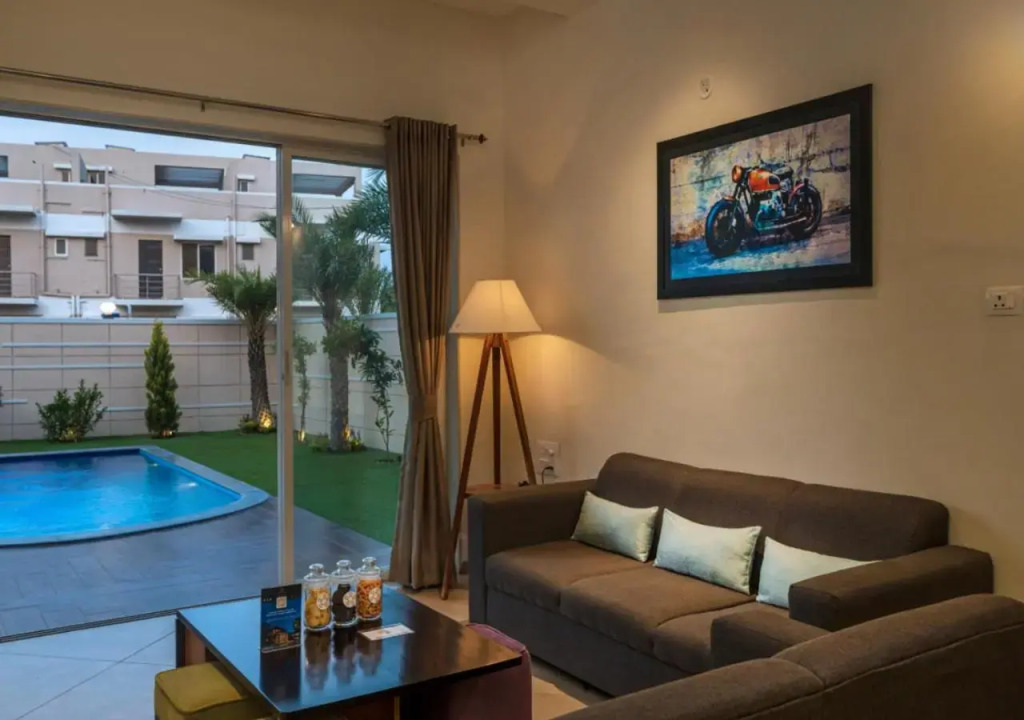 Отель SaffronStays Barney, Lonavala - pet-friendly pool villa near Sunny Da Dhaba, адрес на карте Кхандала, Plot No. 458, Opposite Treasure Island, Maval Taluka, Karla Village Villa No.2, Mannat Heaven, с описанием номеров и правом онлайн бронирования на сайте vashotel.ru , стоимость проживания и удобства.