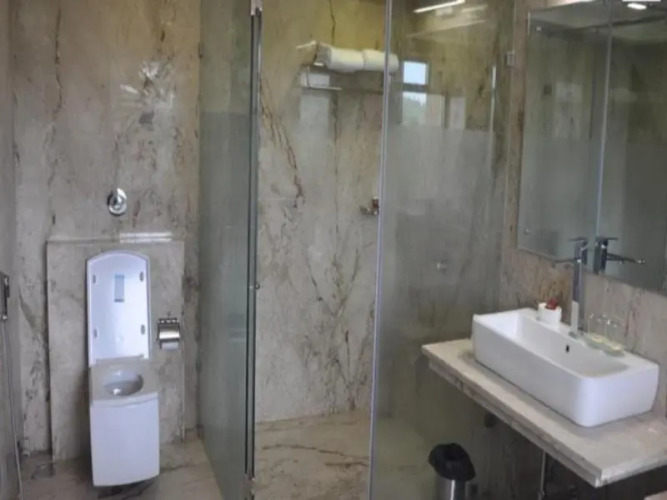 В номере вы найдёте душ, телевизор и тапочки. Оснащение зависит от выбранной категории номера.
