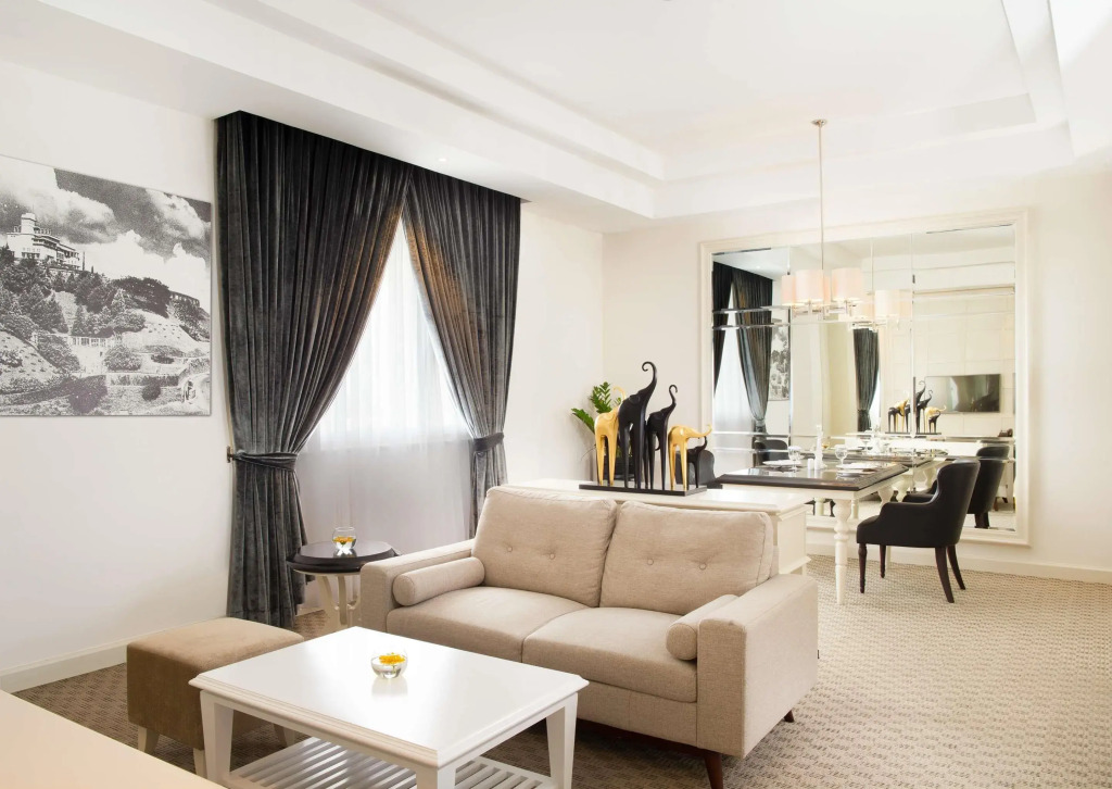 В номере вы найдёте будильник, телевизор, мини-бар, халат и тапочки. Оснащение зависит от выбранной категории номера.