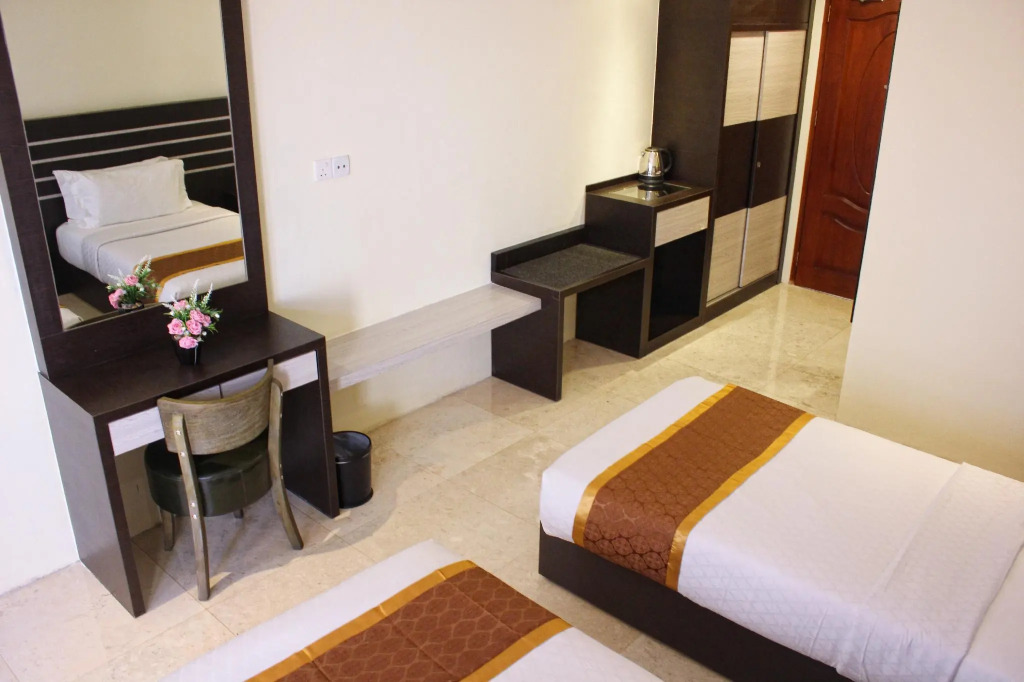 Номер уютно обставлен и оснащён необходимым, чтобы отдохнуть после долгого и насыщенного дня. Имеются душ, телевизор и тапочки. Перечисленные услуги есть не во всех номерах.