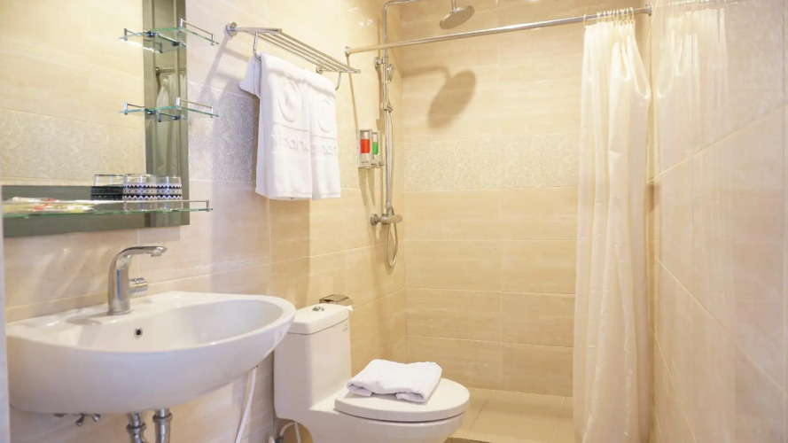 В номере вы найдёте душ, телевизор и тапочки. Оснащение зависит от выбранной категории номера.