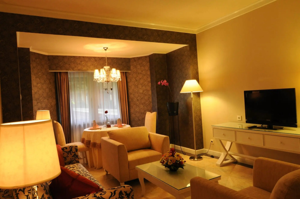 В номере вас будут ждать душ, телевизор, мини-бар и тапочки. Оснащение зависит от выбранной категории номера.
