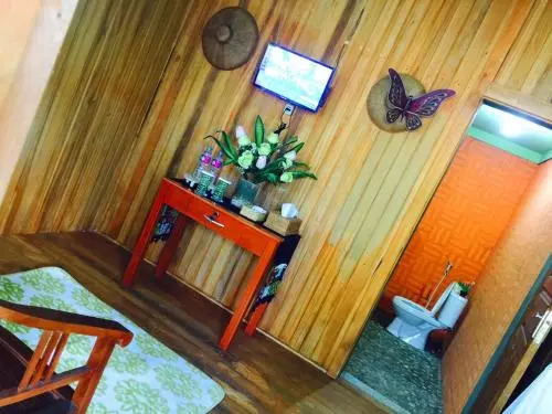 В номере вы найдёте душ, телевизор и тапочки. Оснащение зависит от выбранной категории номера.