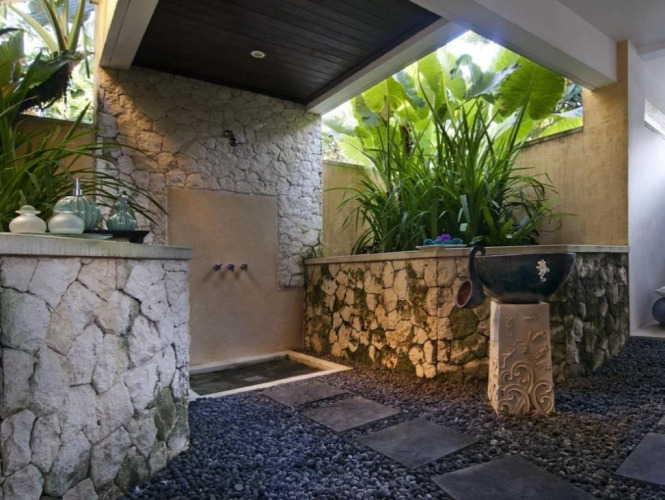На вилле Karang Bali имеется 5 спален с индивидуальными ванными комнатами, полностью оборудованная кухня, столовая и гостиная. В каждой спальне есть кондиционер, кроме того, на вилле есть сейф, минибар и телевизор. Уборка виллы выполняется ежедневно.