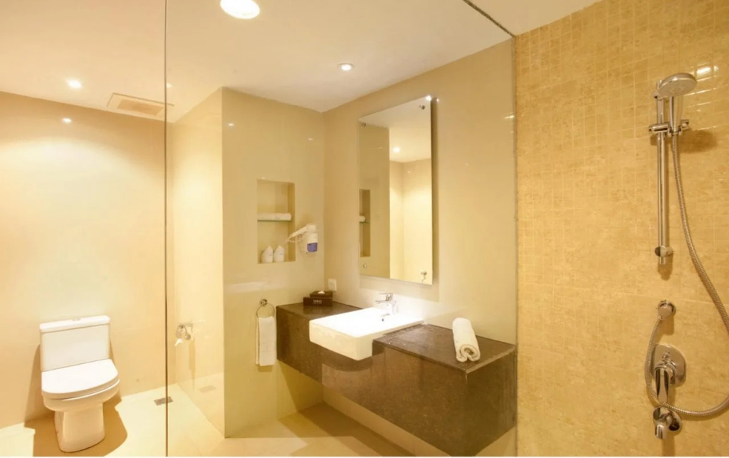 В номере вы найдёте душ, халат и тапочки. Оснащение зависит от выбранной категории номера.