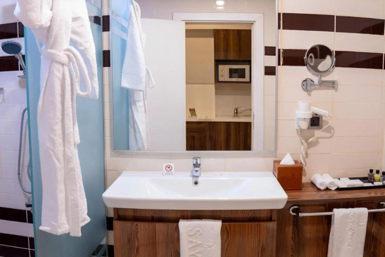 В номере вас будут ждать душ, телевизор и тапочки. Оснащение зависит от выбранной категории номера.