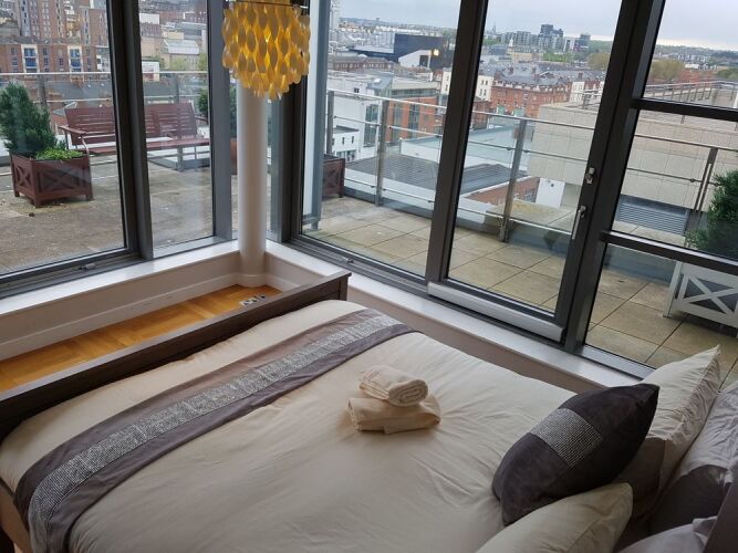 Отель Penthouse Apartment in Smithfield, адрес на карте Дублин, Apartment 79 Block B Smithfield Market, с характеристиками номеров и правом онлайн бронирования на сайте vashotel.ru , цены проживания и удобства.