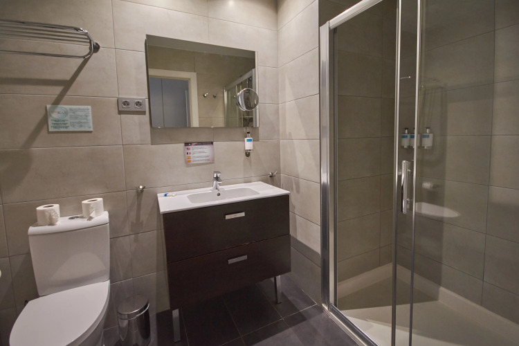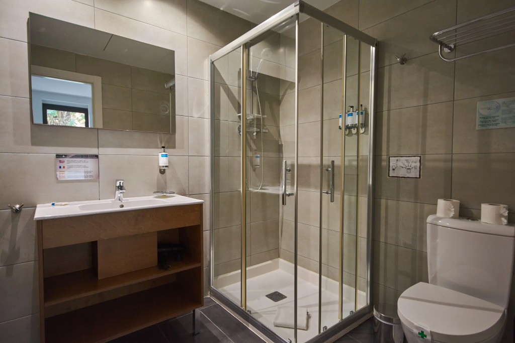В номере вас будут ждать душ, телевизор и тапочки. Оснащение зависит от выбранной категории номера.