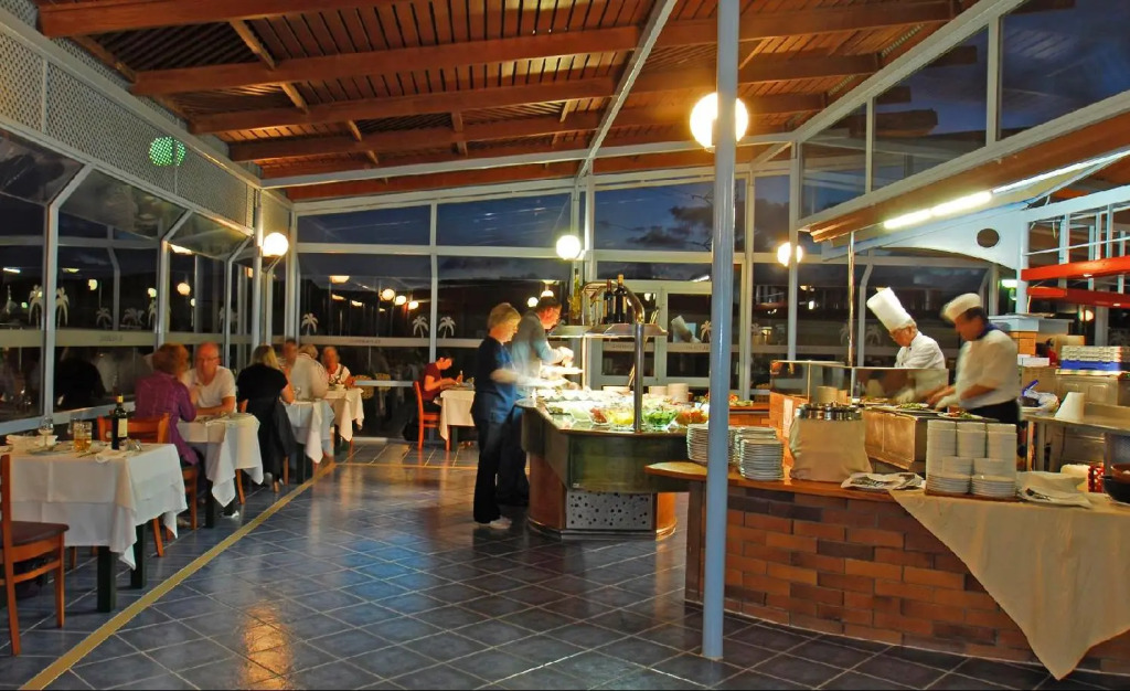 Обеденная зона в отеле представлена 3 барами и рестораном средиземноморской кухни. Питание включает в себя блюда по системе «шведский стол».