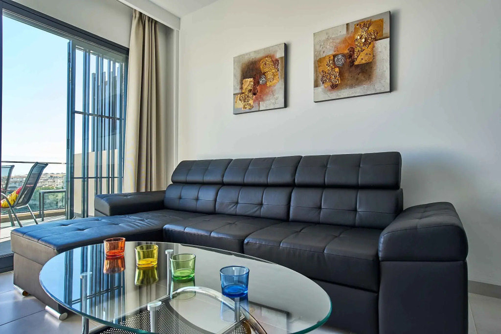 Апартаменты с двумя спальнями подходят для размещения до 4 гостей. В них есть одна двуспальная кровать и две односпальные кровати. Кроме того, имеется солнечная терраса с видом на море.