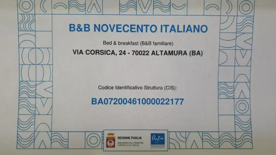 Отель B&B Novecento Italiano, адрес на карте Альтамура, Via Corsica 24/a, 70022 Altamura, Italy, с характеристиками номеров и правом онлайн бронирования на площадке ВашОтель.RU , стоимость проживания и удобства.