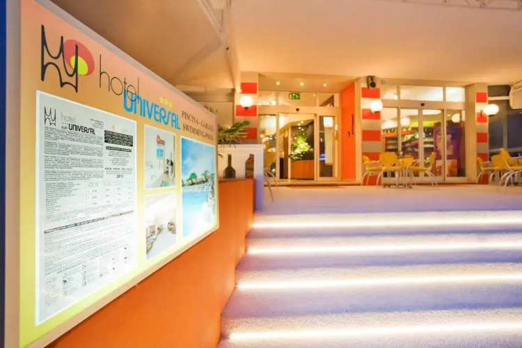 Отель Universal 3 звезды, адрес на карте Каорле, Via Milano 6, с описанием номеров и доступностью онлайн бронирования на ресурсе vashotel.ru , цены проживания и удобства.