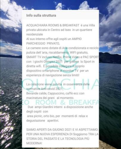 Подходящий вариант для бюджетного отдыха — отель «ACQUACHIARA Rooms & Breakfast» располагается в Исео. Этот отель находится в самом центре города. Утром — выпейте кофе, наблюдая из окна за жизнью города. Рядом с отелем можно прогуляться. Неподалёку: Парк Маренци, Парк Суарди и Галерея Академии Каррары.