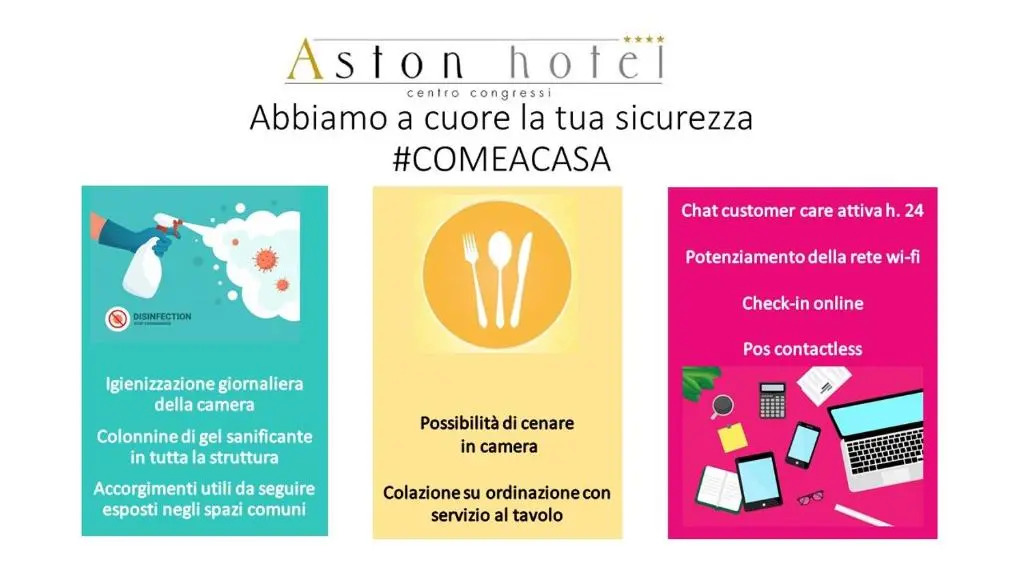 В отеле Aston Hotel есть ресторан и бар в лобби отеля. Отель предлагает круглосуточное обслуживание номеров. Беспроводной доступ в Интернет в зонах общественного пользования. В этом отеле в городе Турин имеется пространство для проведения встреч и конференций; предлагается следующее: помощь в организации банкетов, конференц-залы и конференц-залы (для небольших групп). Предусмотрена бесплатная парковка для гостей. Дополнительные услуги отеля включают следующее: многоязычный персонал, помощь туристамуслуги по бронированию билетов и лифт.