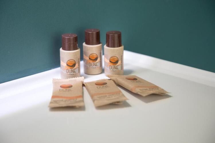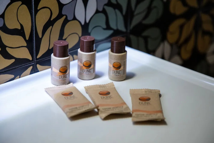 Social distancing measures are in place and guests are provided with hand sanitizer.