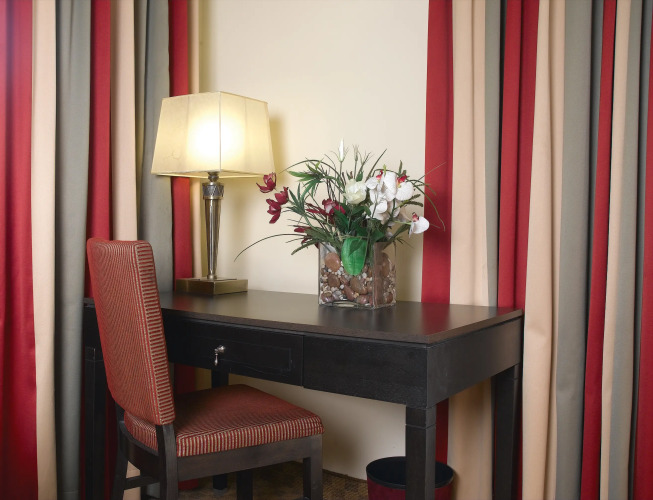 Номер уютно обставлен и оснащён необходимым, чтобы отдохнуть после долгого и насыщенного дня. Имеются будильник, душ, телевизор, мини-бар, халат и тапочки. Оснащение зависит от выбранной категории номера.