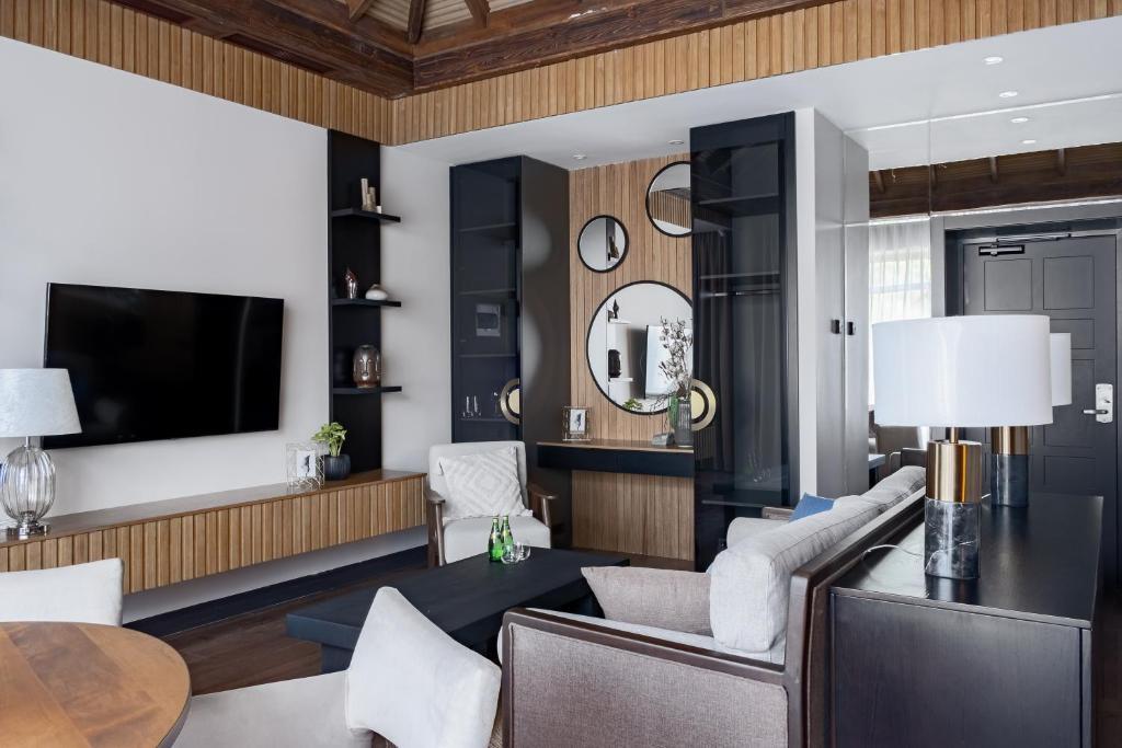 На территории расположена сауна на берегу озера, собственный пляж, открытые беседки, теннисный корт, плавательный бассейн, баня на дровах, ресторан Le pin, каминный зал и библиотека, лобби-бар, винная комната. Рядом с отелем — собственная бесплатная парковка.