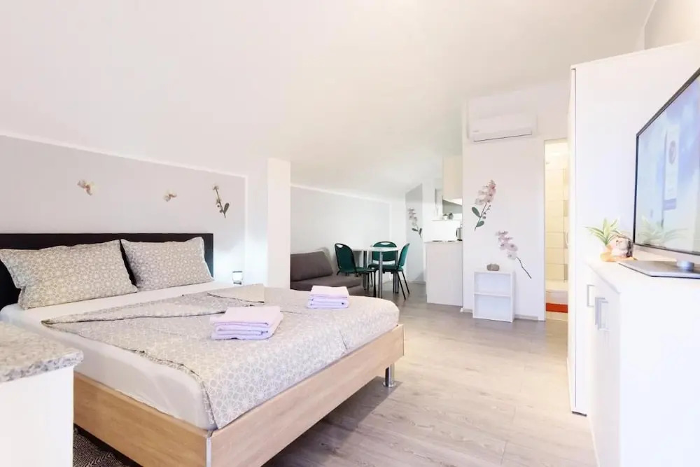 Отель Studio Apartment With Balcony Near Beach Apartmani Orhideja, адрес на карте Карин Горни, Ulica Xx, с характеристиками номеров и правом онлайн бронирования на ресурсе ВашОтель.RU , стоимость проживания и удобства.