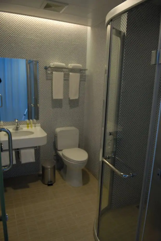 В номере вы найдёте душ, телевизор и тапочки. Оснащение зависит от выбранной категории номера.