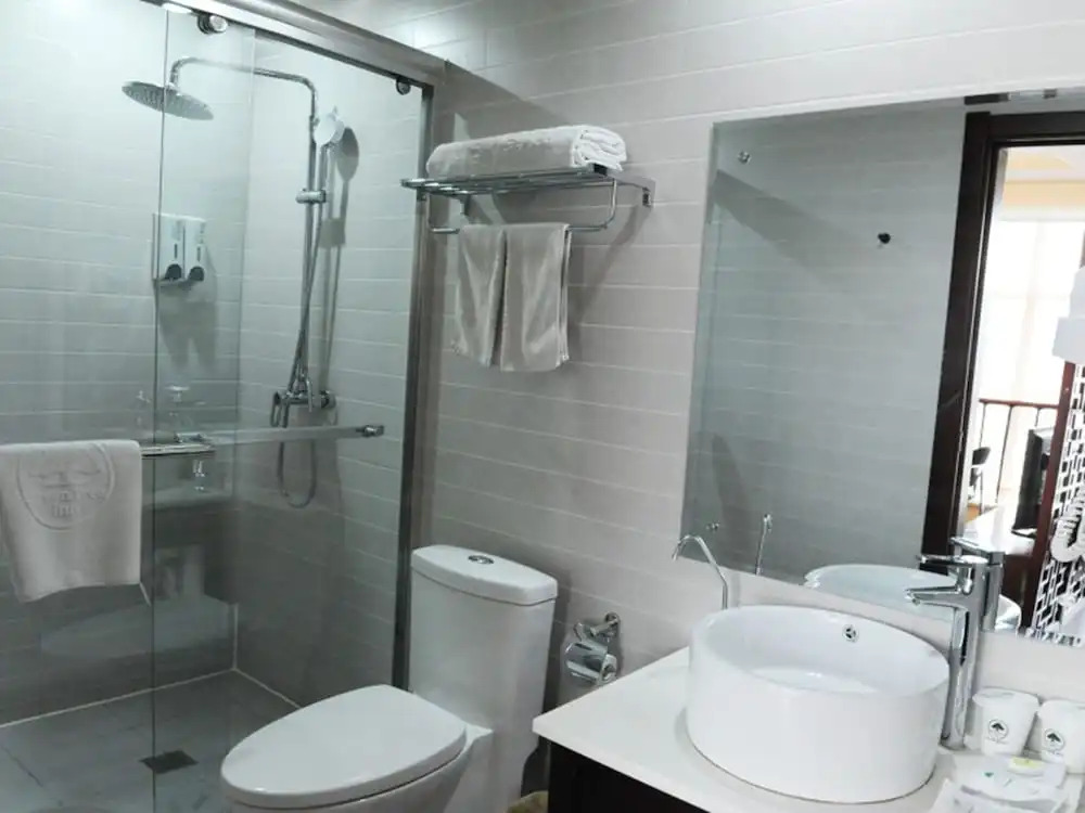В номере вы найдёте душ, телевизор и тапочки. Оснащение зависит от выбранной категории номера.